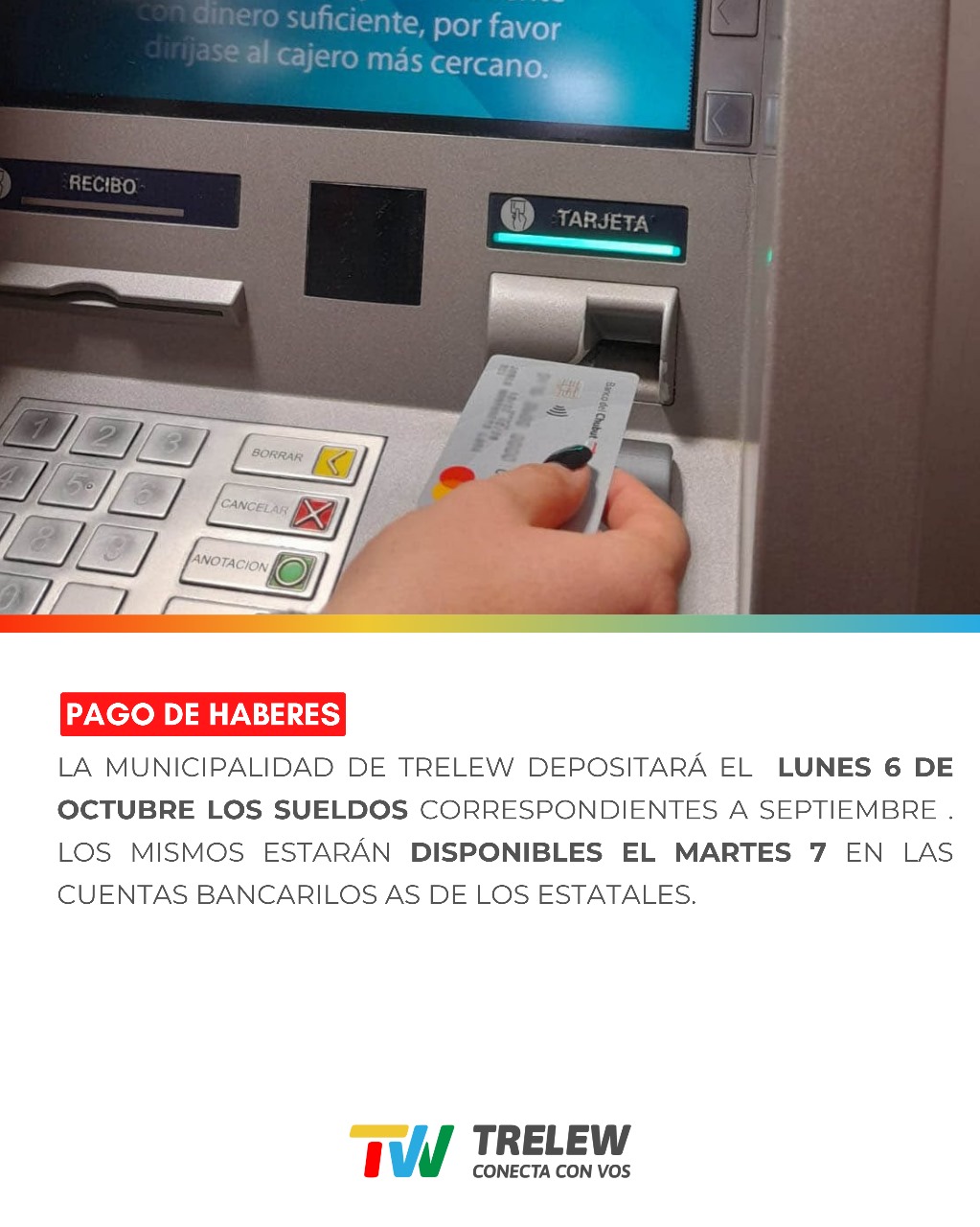 La Municipalidad de Trelew informa que el lunes 6 de octubre se depositarán los sueldos correspondientes a septiembre, de los empleados públicos de su dependencia.