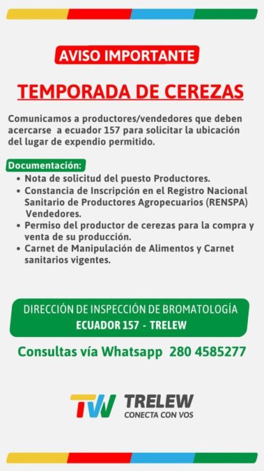 La Dirección de Inspección de Bromatología de la Municipalidad de Trelew informa que se encuentra abierta la inscripción de habilitación para productores y vendedores que deseen comercializar cerezas durante la próxima temporada.