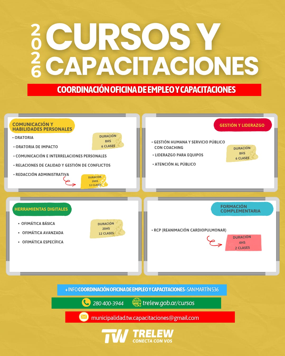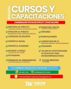 Para más información e inscripciones, los interesados pueden acercarse a la Coordinación de la Oficina de Empleo y Capacitaciones, ubicada en San Martín 536, comunicarse al teléfono 280 400-3944, ingresar a trelew.gob.ar/cursos o escribir al correo municipalidad.tw.capacitaciones@gmail.com.