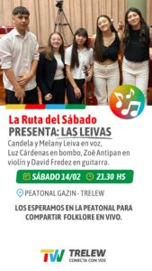 El Municipio de Trelew invita a la comunidad a participar de una nueva edición de La Ruta del Sábado, que se desarrollará el sábado 14 de febrero en la peatonal Gazín, con una doble propuesta musical que reunirá a los grupos Amanecer Chamamecero y Las Leivas, promoviendo el encuentro ciudadano y el disfrute de la cultura en espacios públicos.