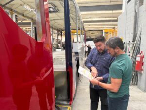 El intendente de Trelew, Gerardo Merino, junto al gerente de la firma El 22, Ariel Jones, visitó la fábrica Italbus, donde se realiza el carrozado de las unidades que llegarán a la ciudad, en el marco del proceso de renovación de la flota de transporte urbano.