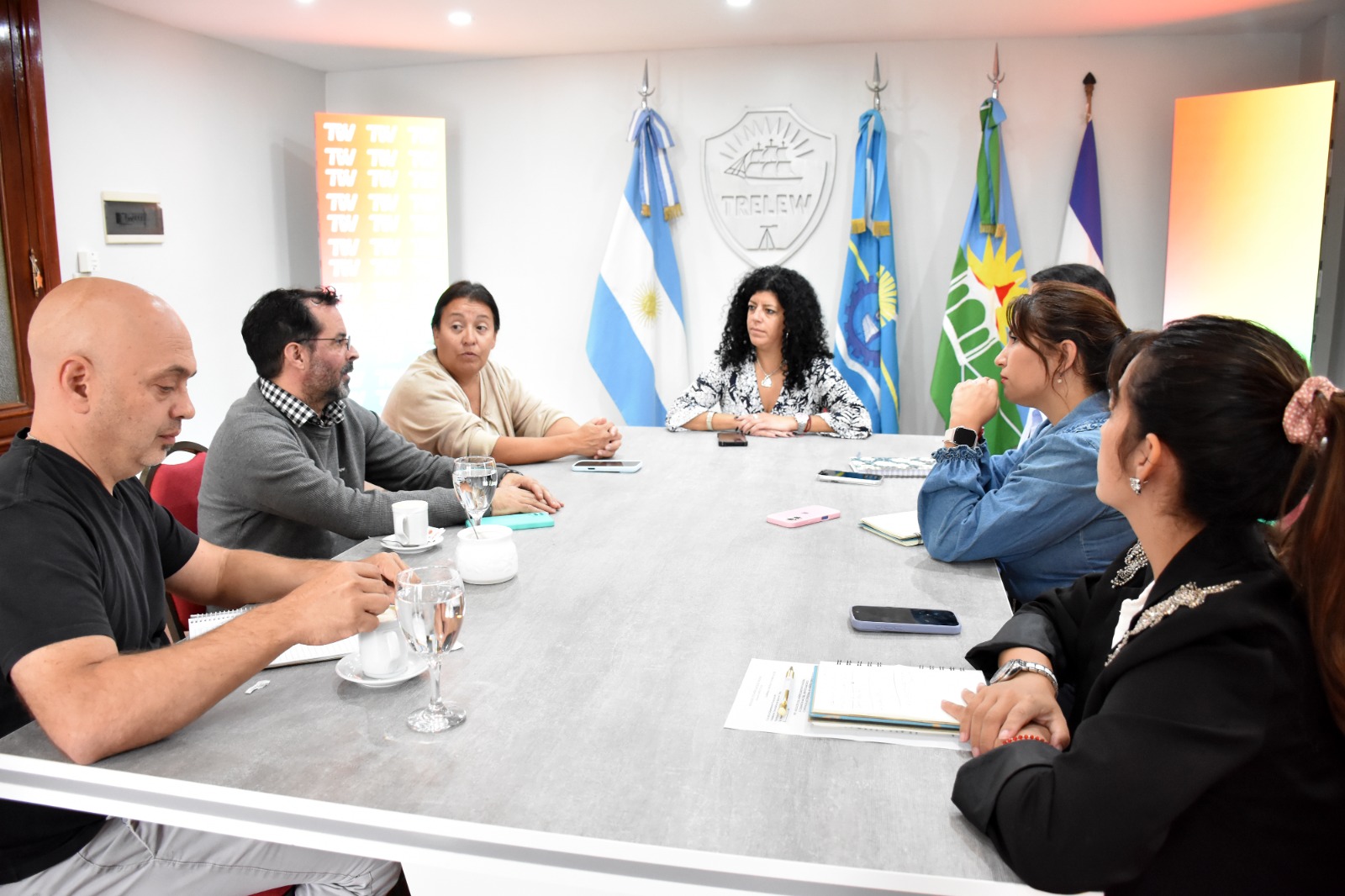 El encuentro se llevó adelante en el Salón Histórico Municipal y contó con la participación de la coordinadora General de Intendencia y Gabinete, Lorena Condinanzo; la secretaria de Producción, Comercio, Industria y Turismo, Andrea Rapetti; y la coordinadora de Turismo, Florencia Aressi. En representación de la Asociación Hotelera y Gastronómica de Trelew participaron Germán Scandroglio y Marcelo Díaz Keiran.