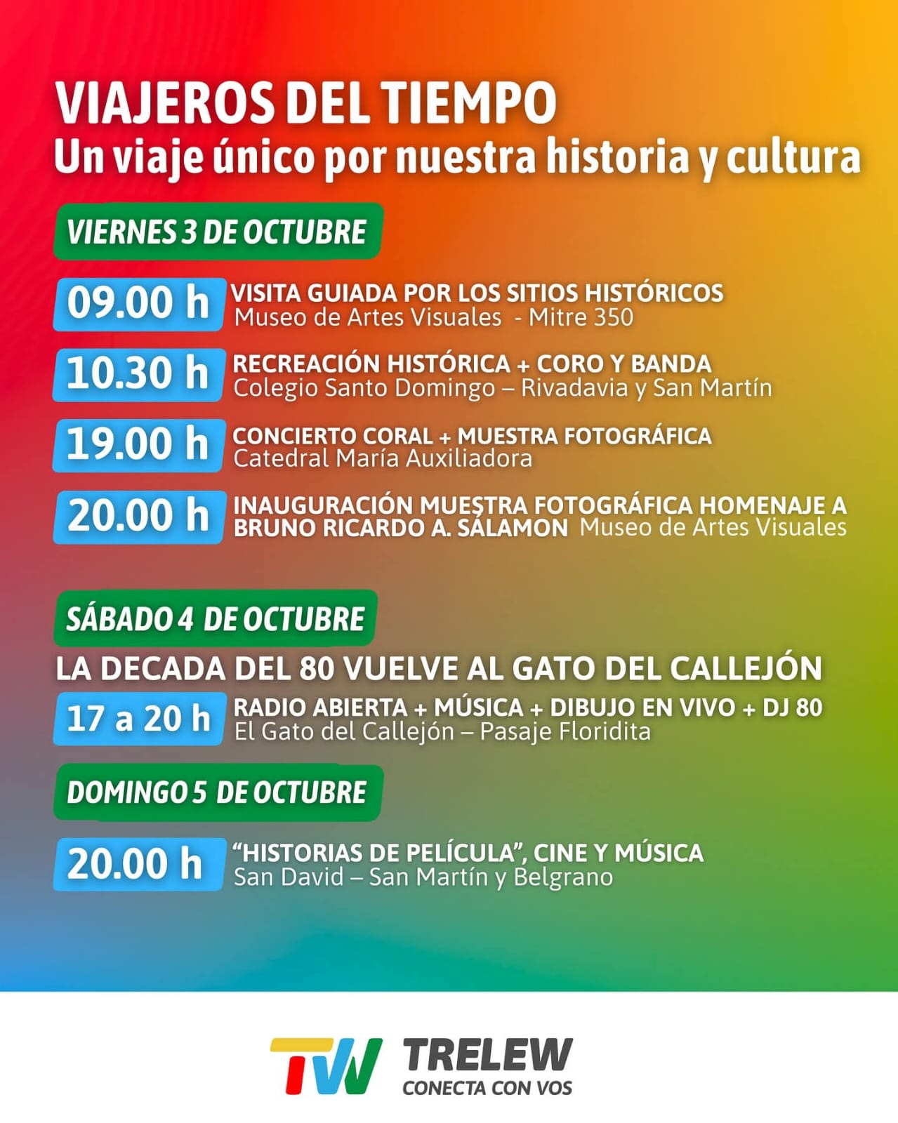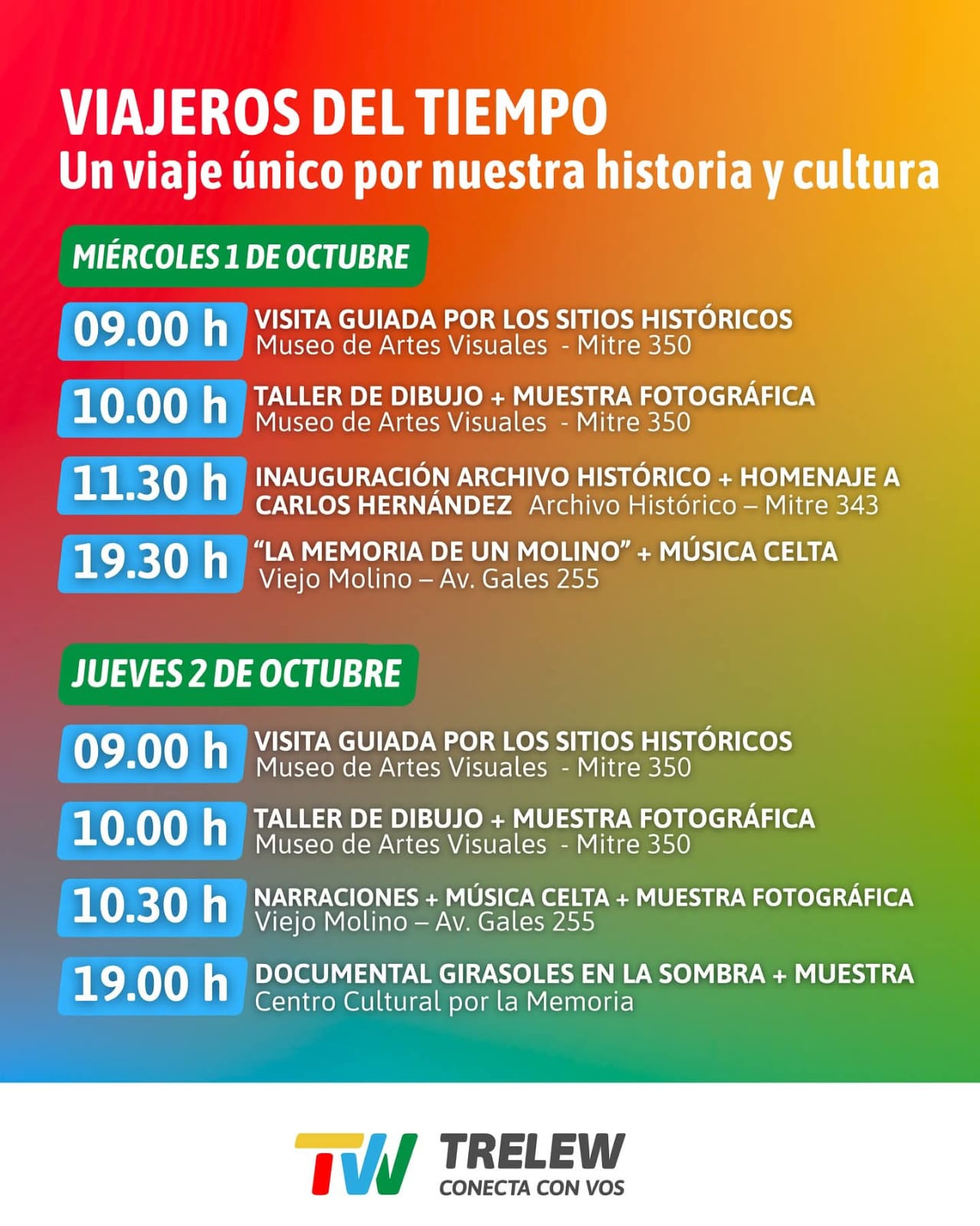 La Municipalidad de Trelew dará inicio este miércoles 1 de octubre al evento cultural “Viajeros del Tiempo”, que se extenderá hasta el domingo 5 con una variada agenda de propuestas históricas, artísticas y educativas.